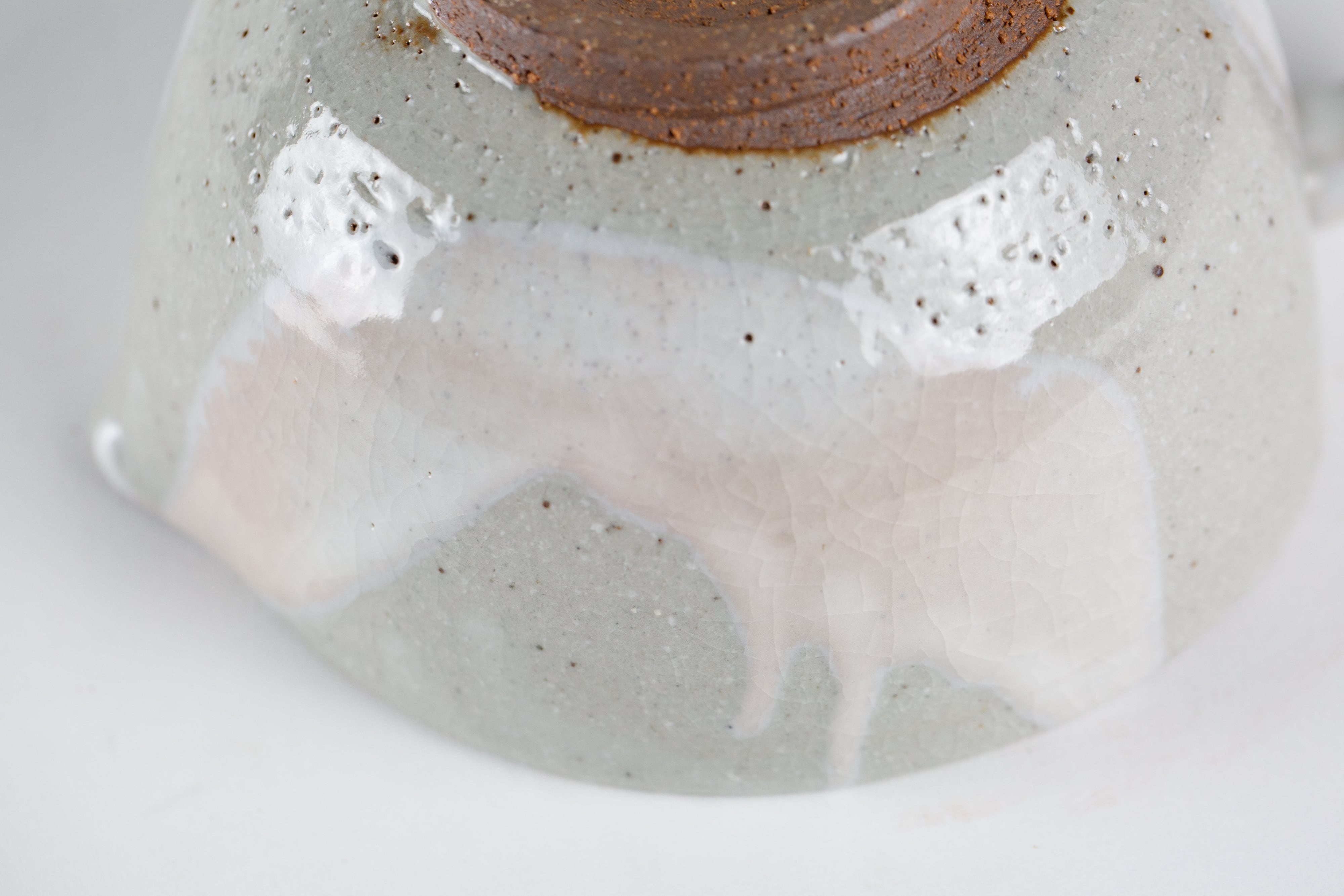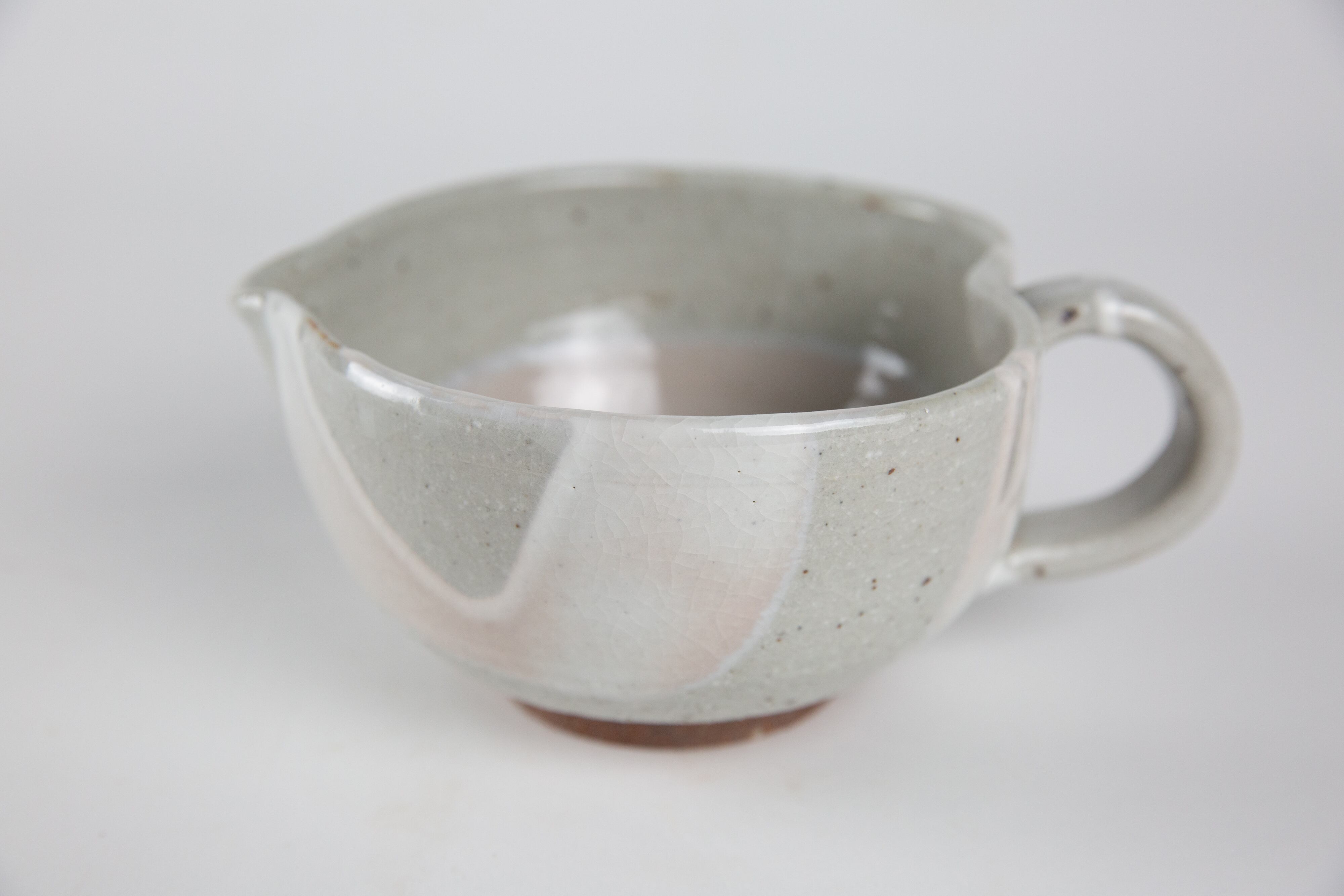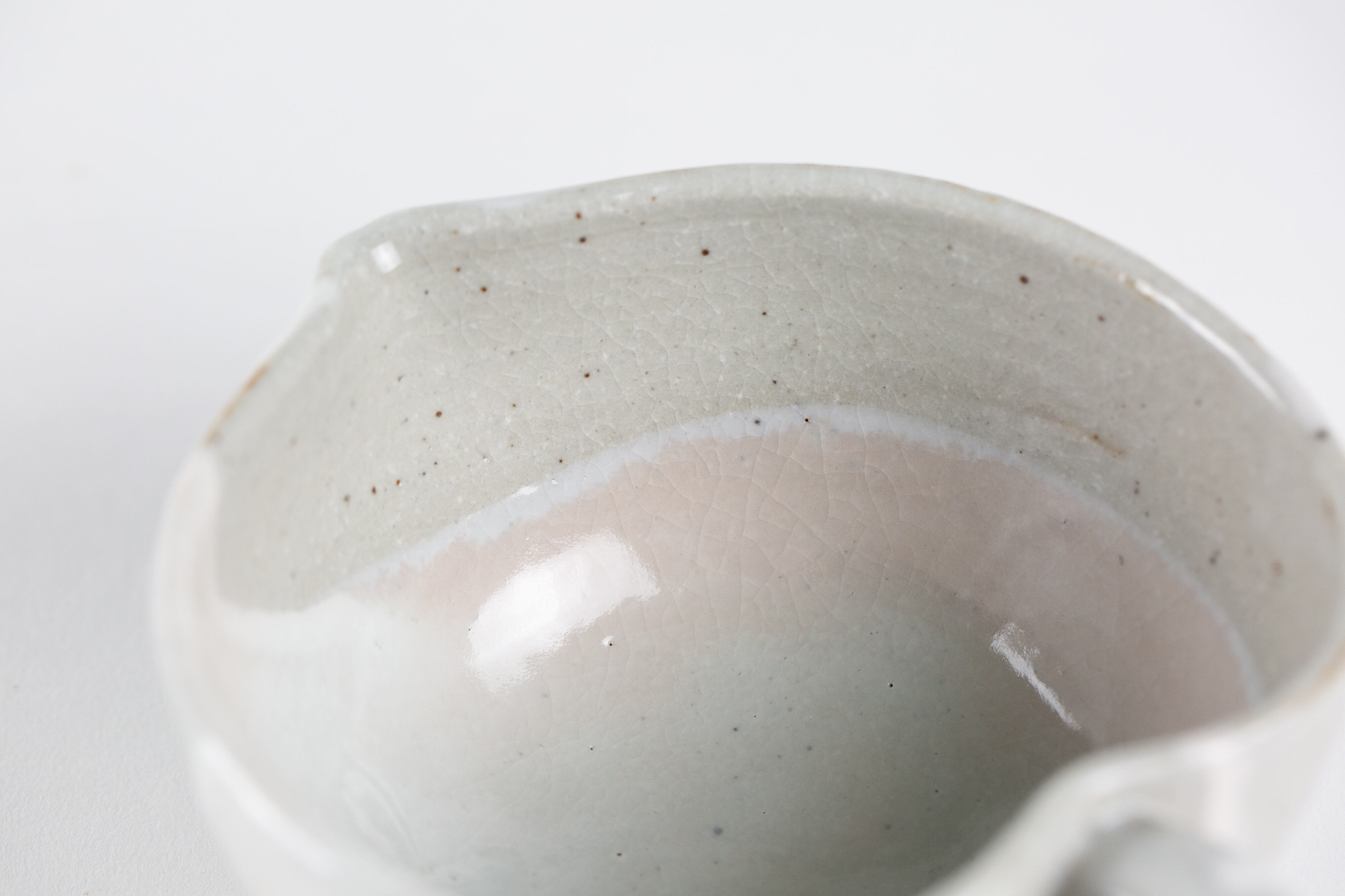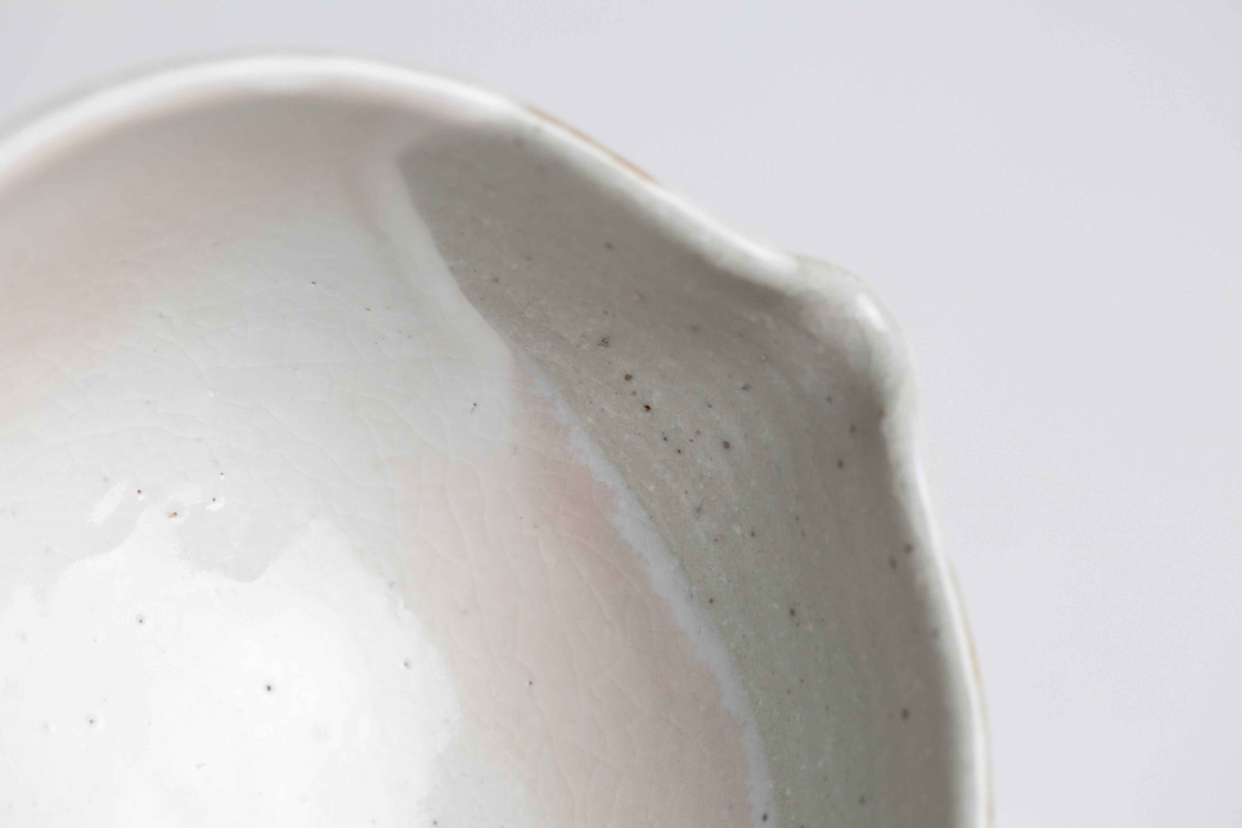 粉引き(ベースの粘土の上に、白化粧という白い泥をかけ、釉薬をかけて焼いた器を「粉引」と言います。)の部分に所々うっすらと、白く穏やかなピンク色が出ているのが見どころです。