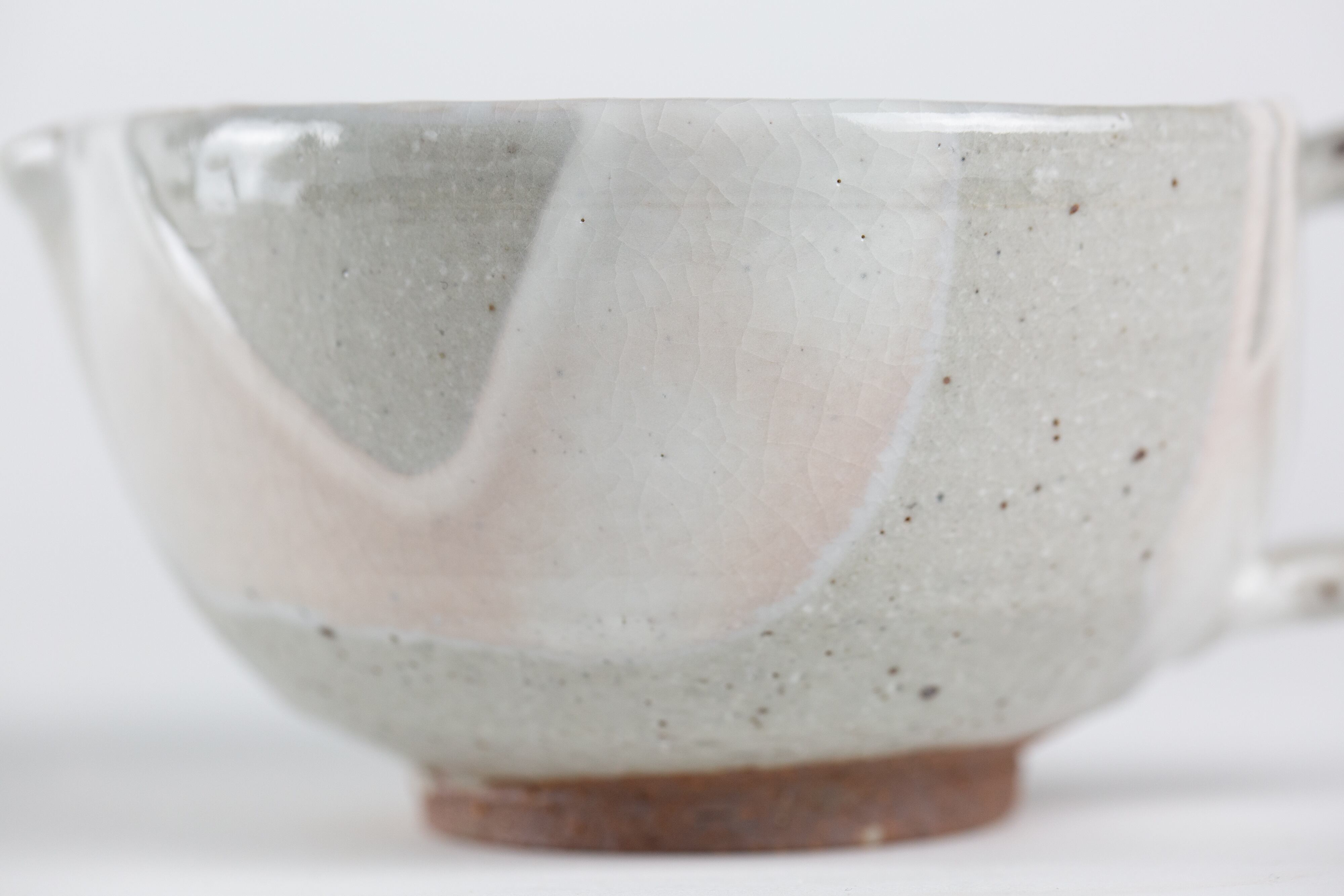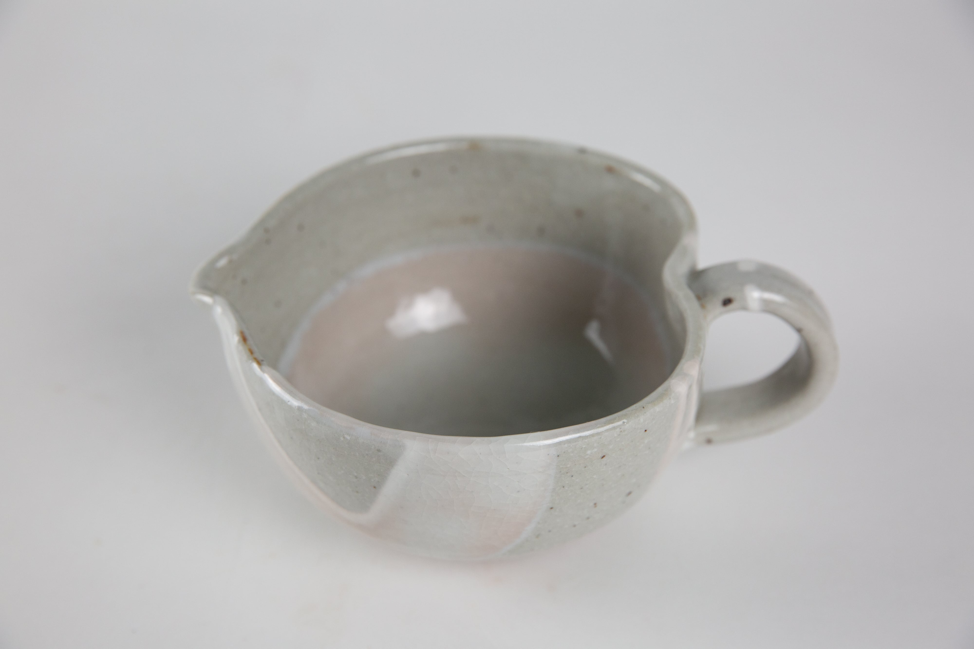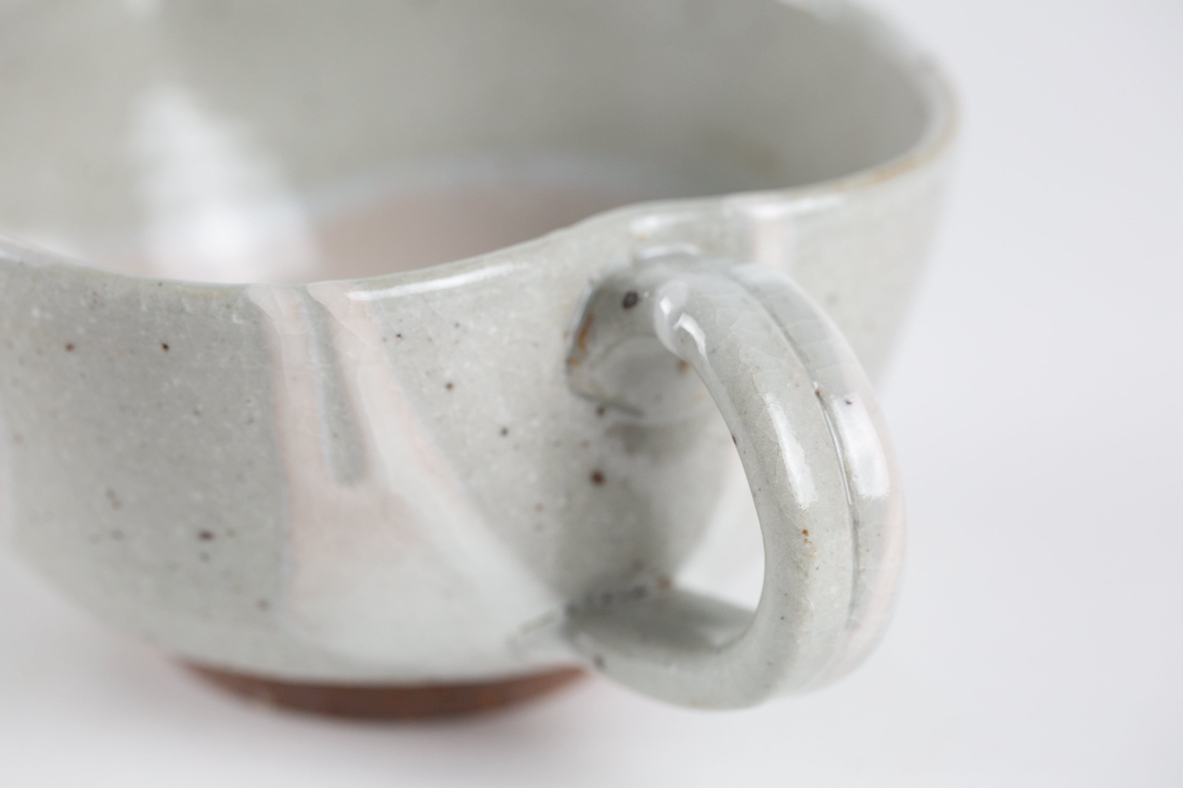 粉引き(ベースの粘土の上に、白化粧という白い泥をかけ、釉薬をかけて焼いた器を「粉引」と言います。)の部分に所々うっすらと、白く穏やかなピンク色が出ているのが見どころです。