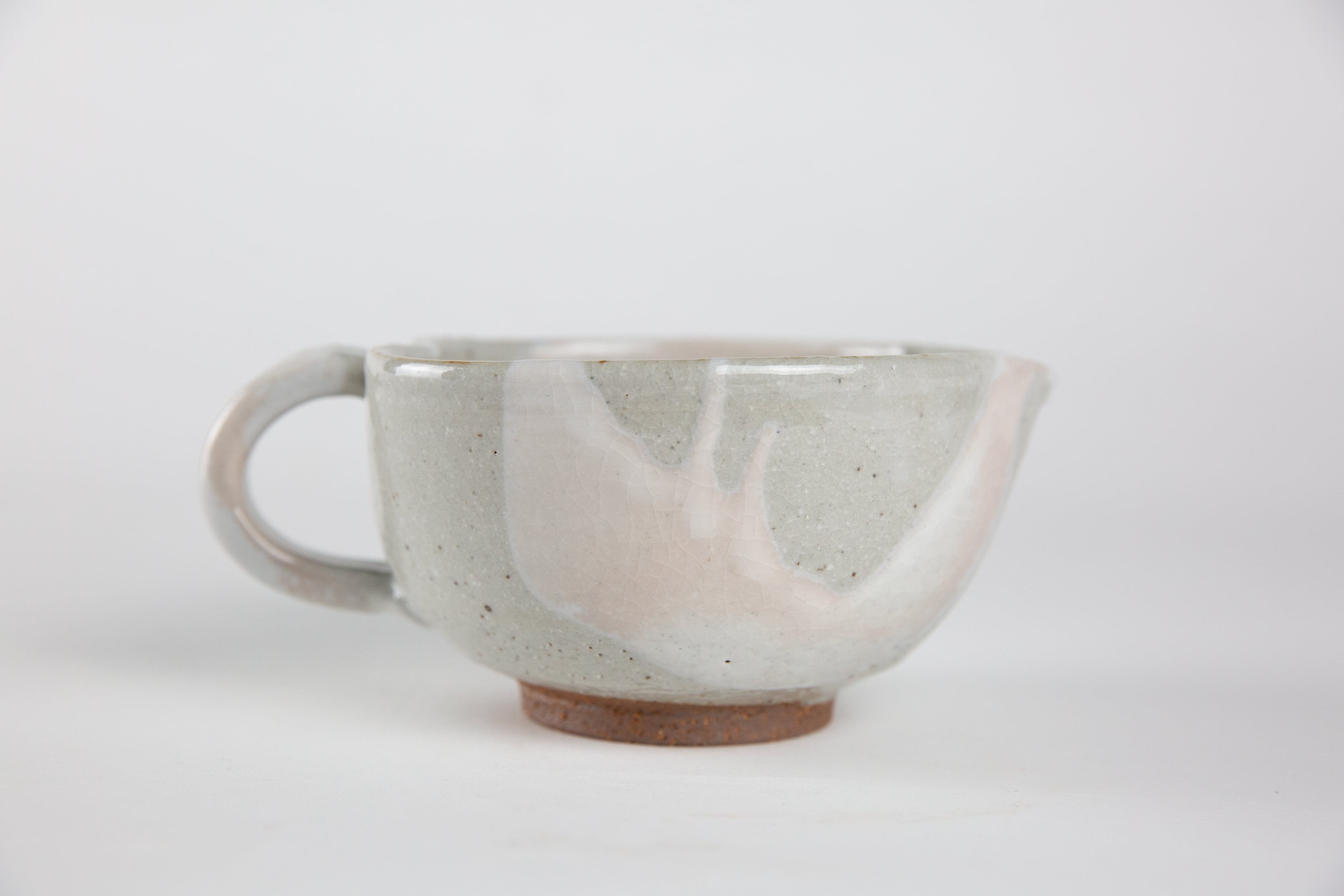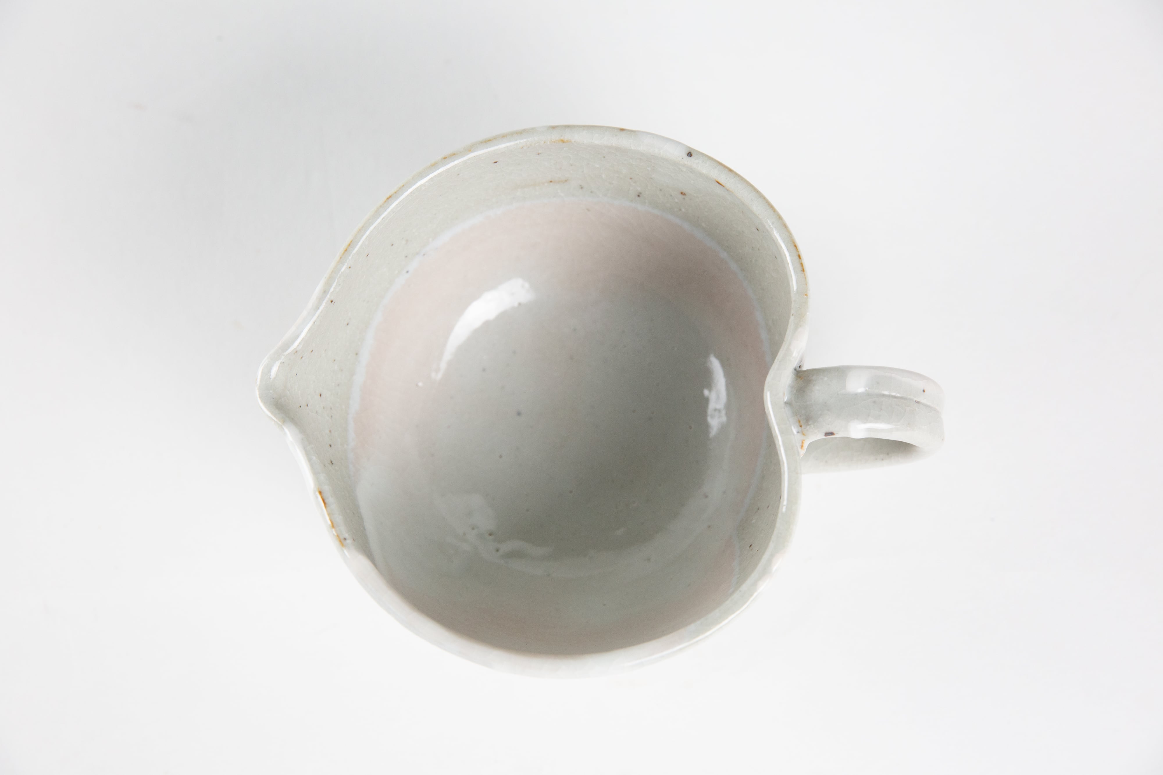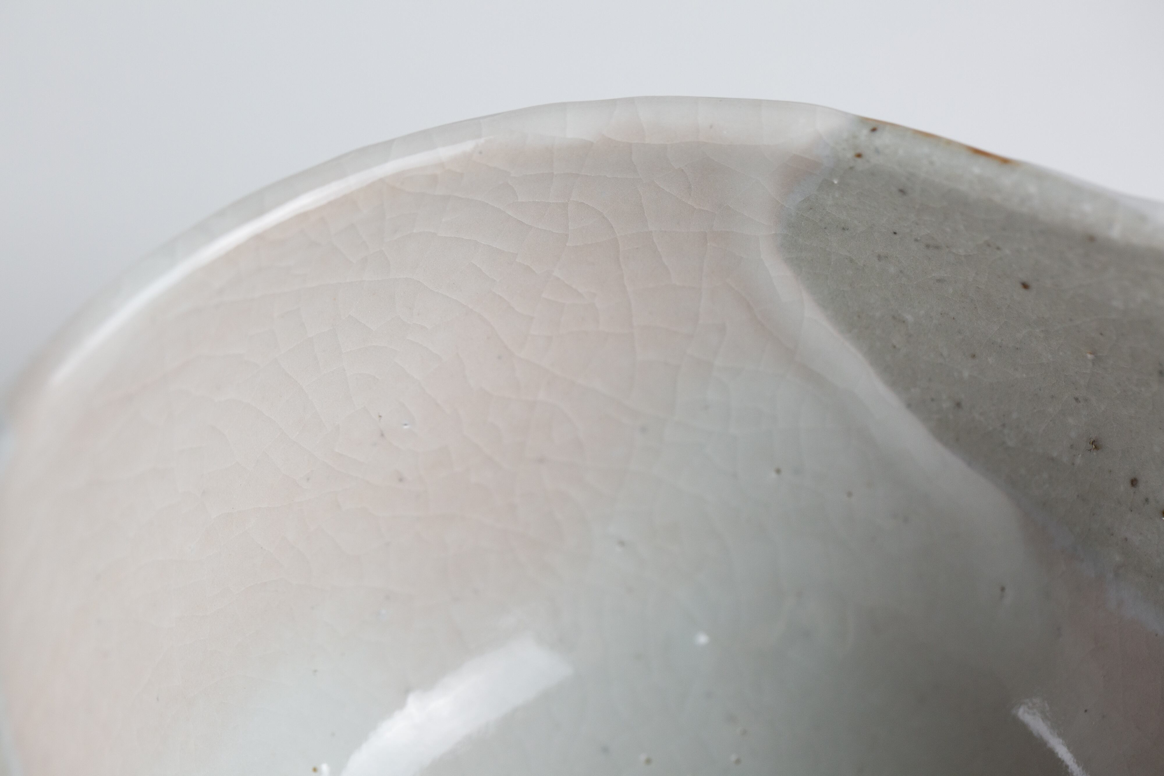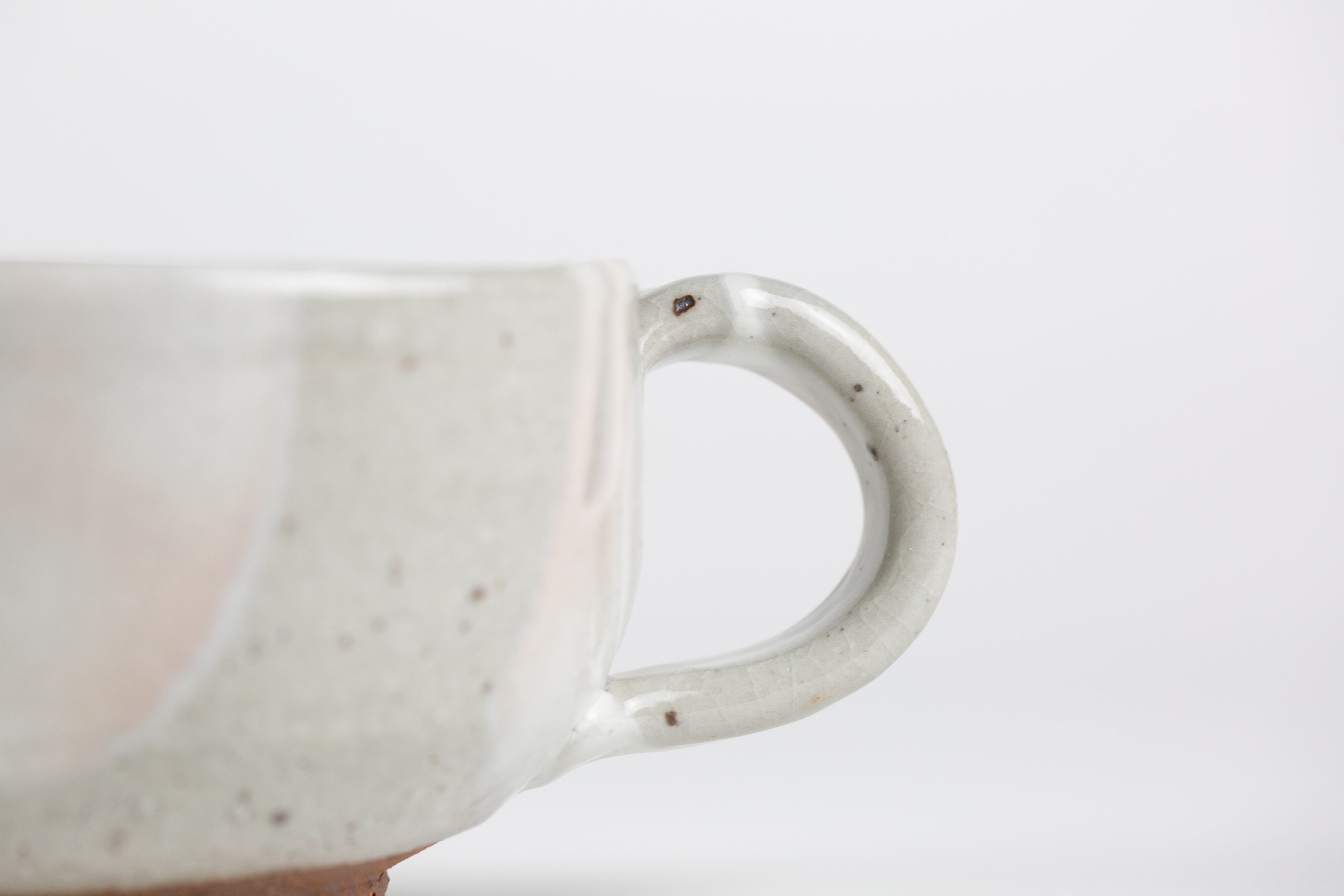 粉引き(ベースの粘土の上に、白化粧という白い泥をかけ、釉薬をかけて焼いた器を「粉引」と言います。)の部分に所々うっすらと、白く穏やかなピンク色が出ているのが見どころです。