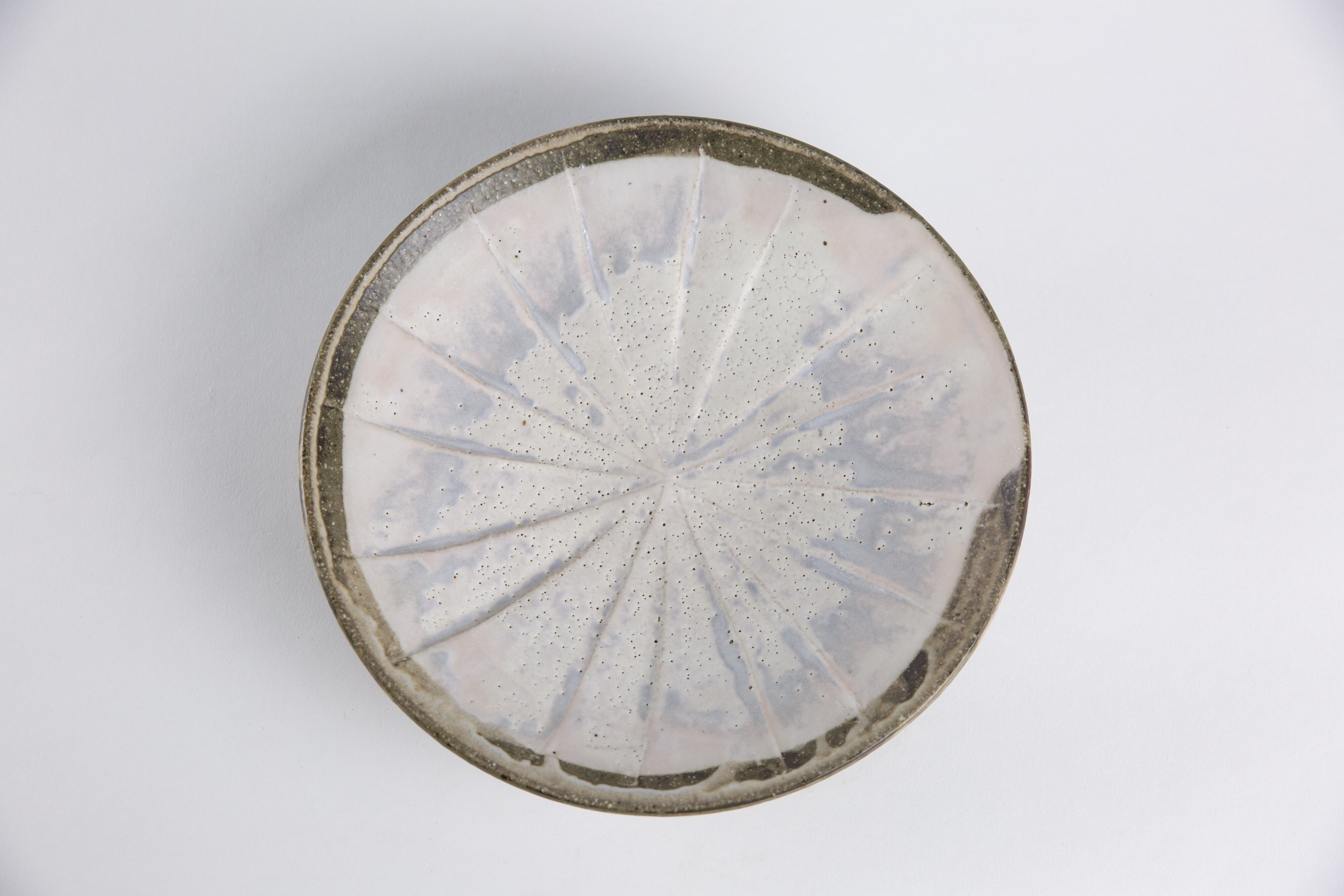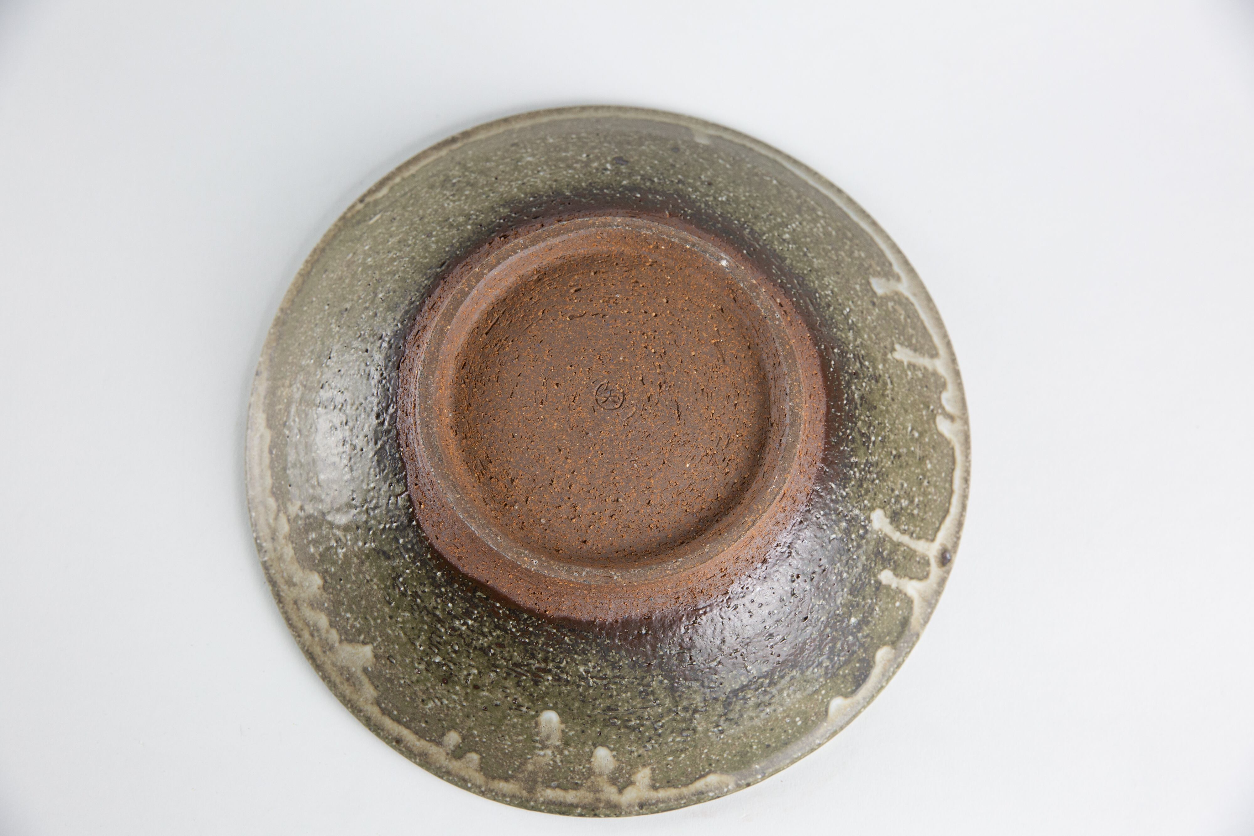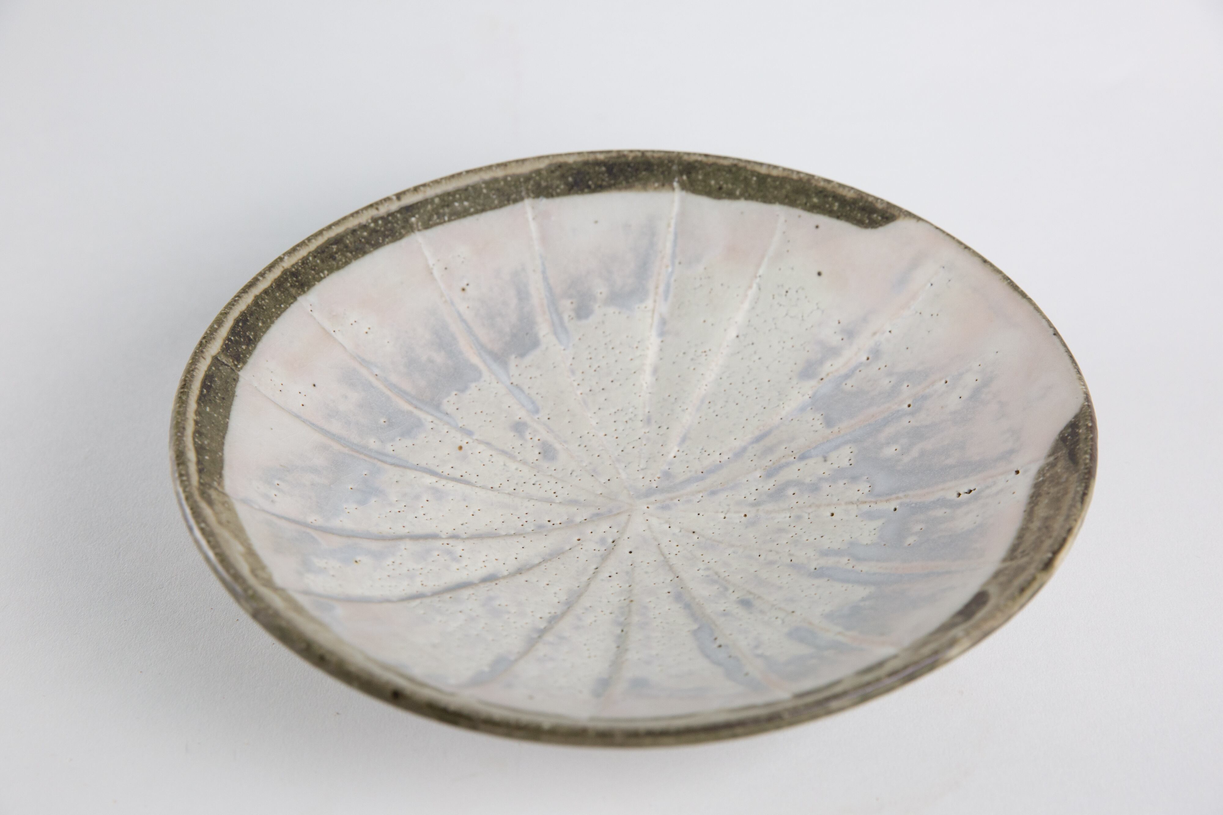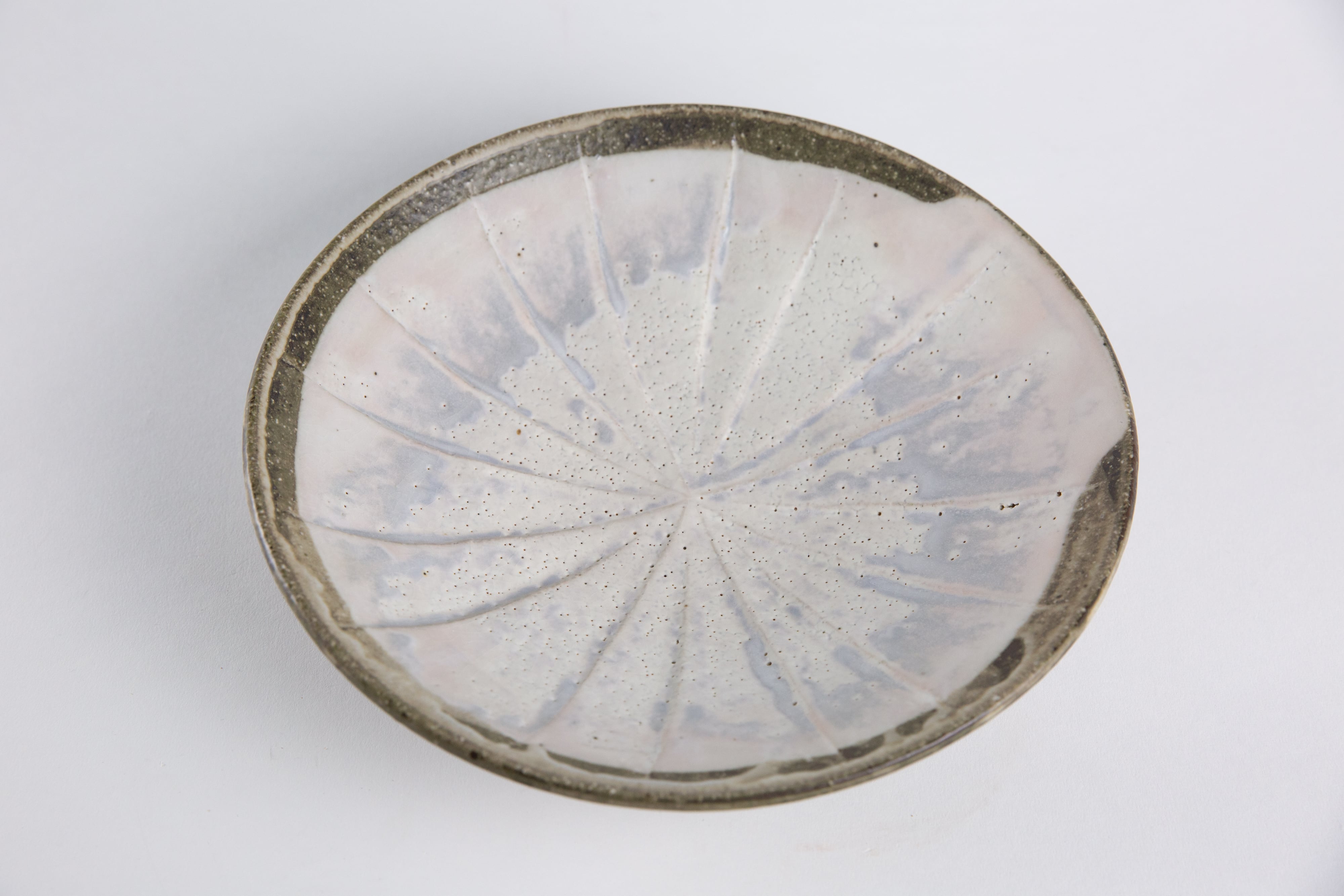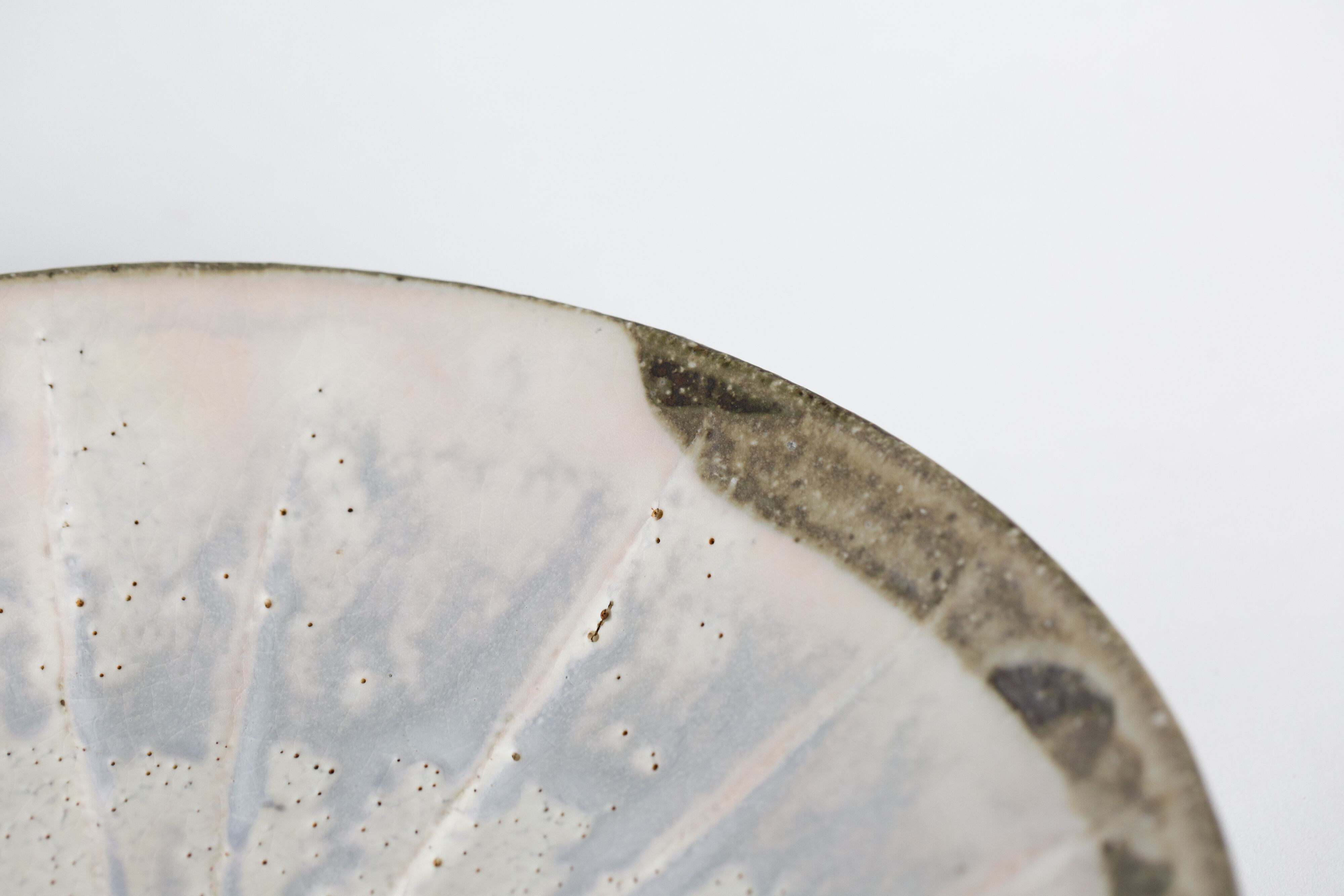 粉引き(白化粧という白い泥をかけること)した上に灰釉を掛けています。