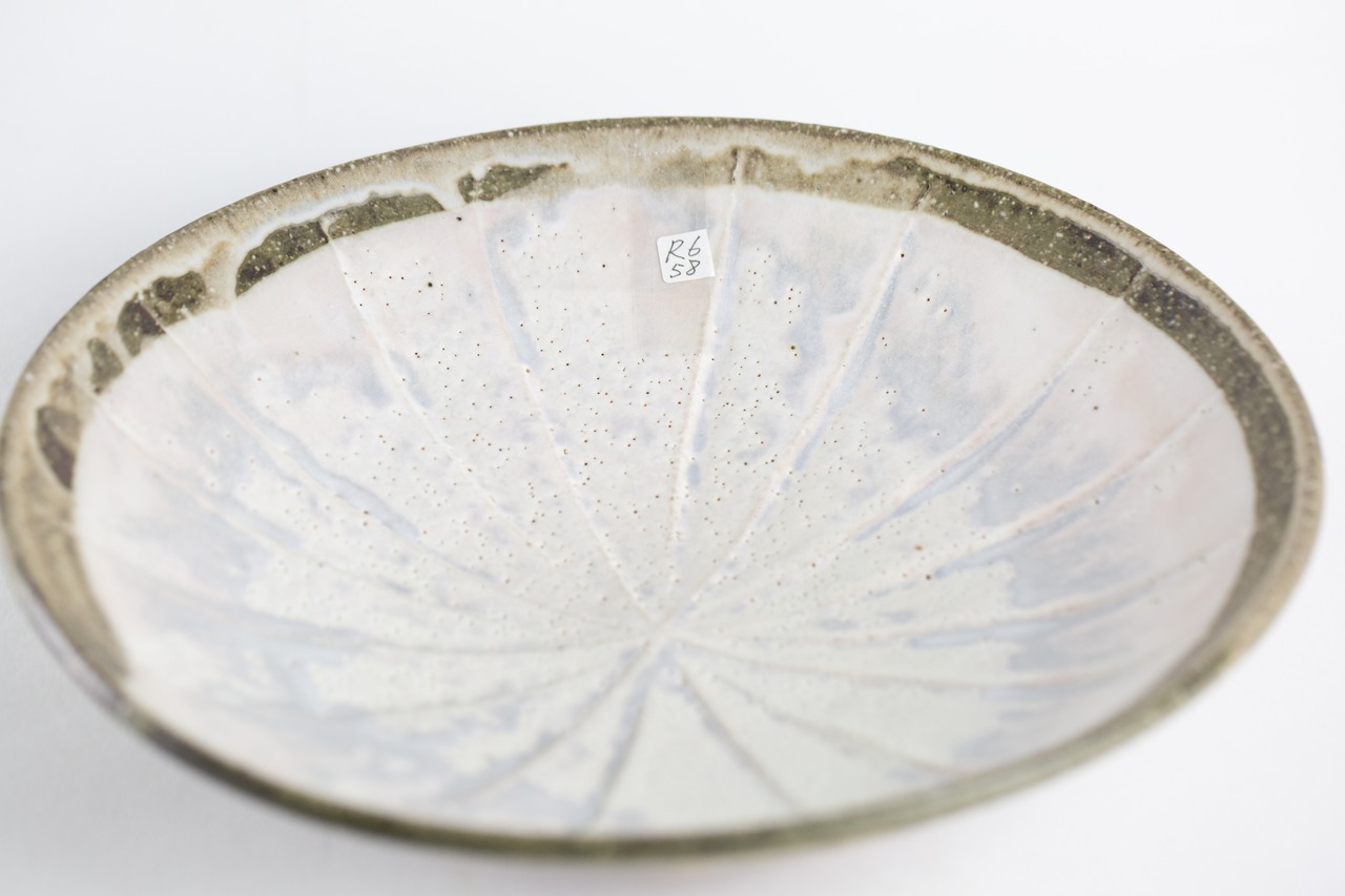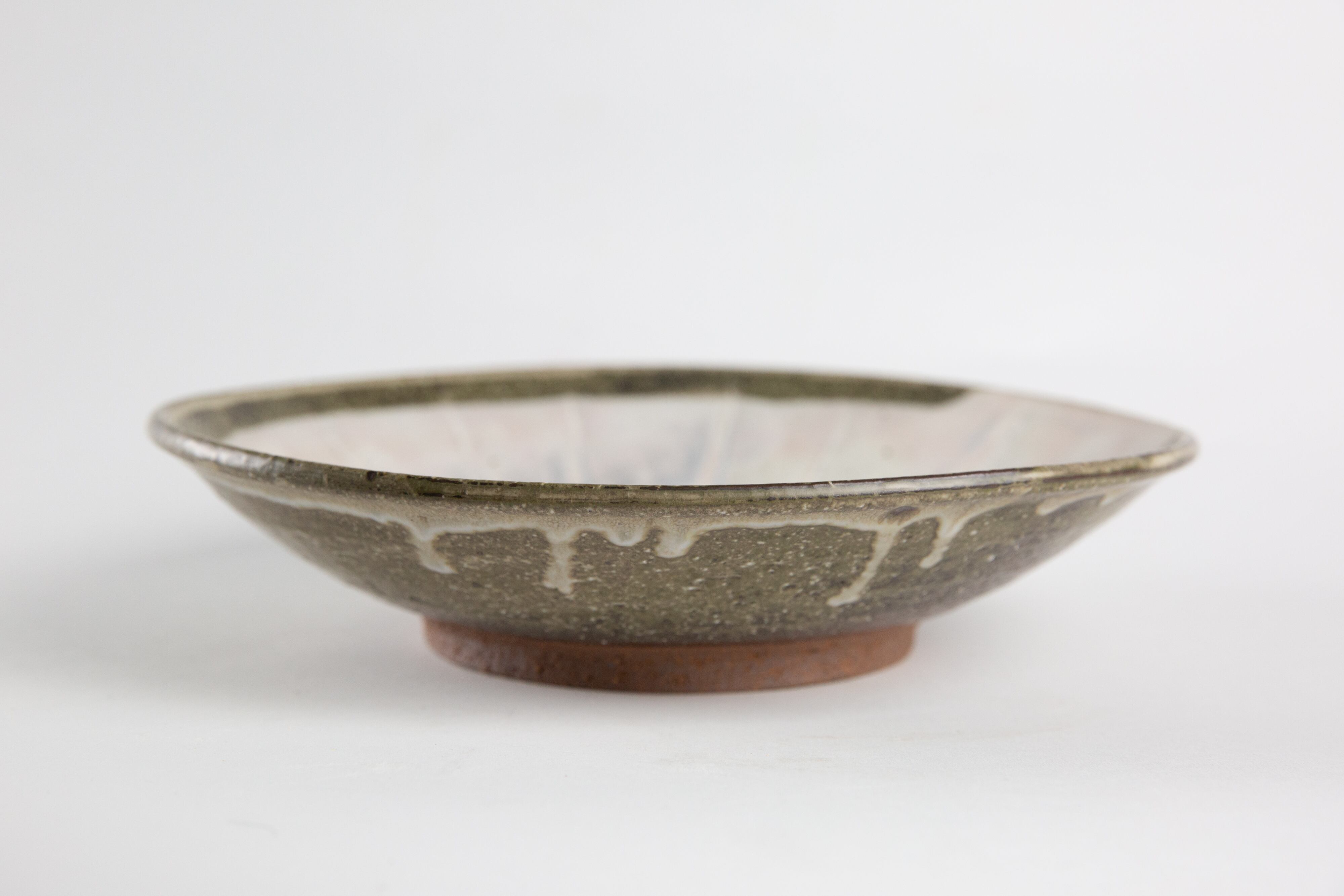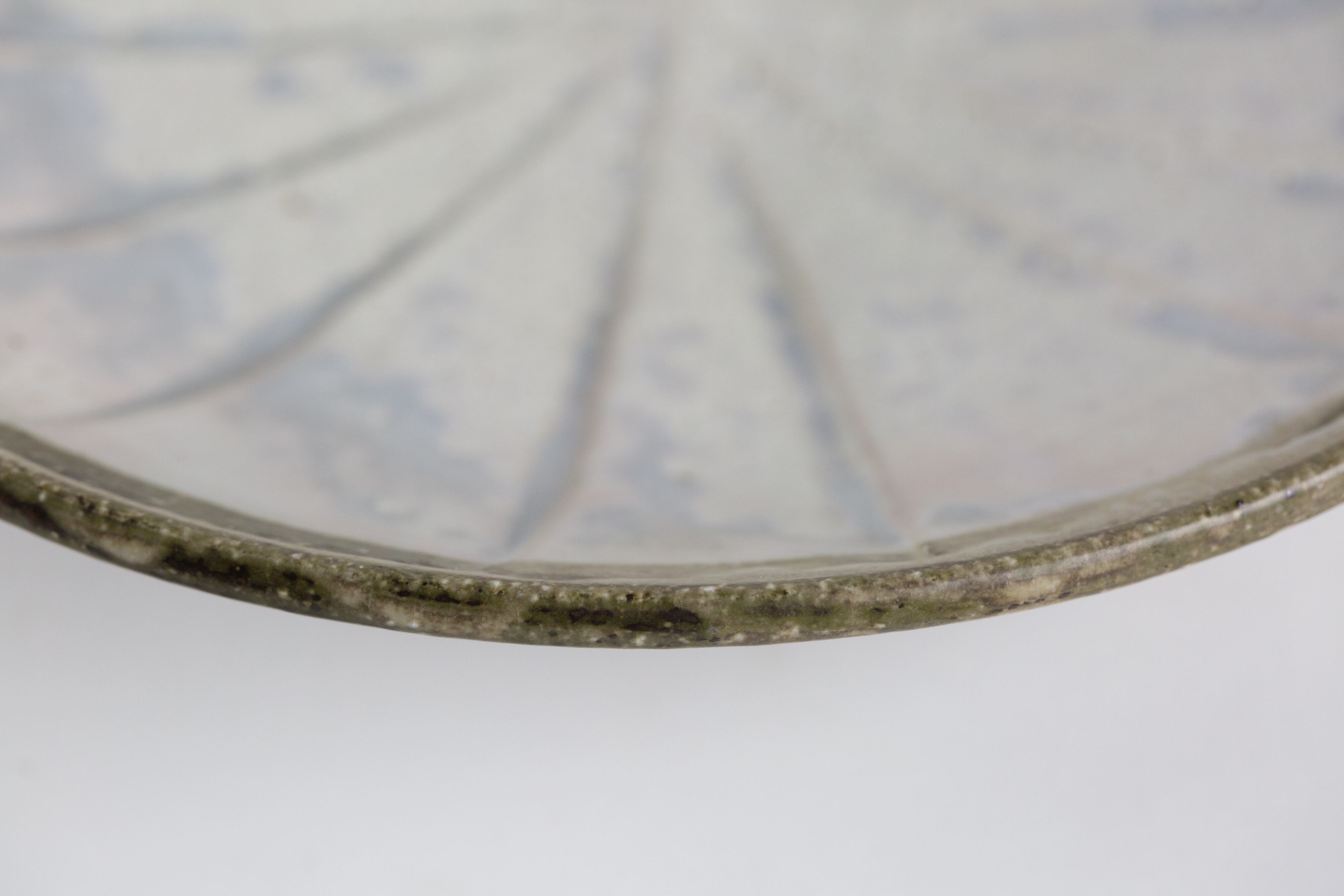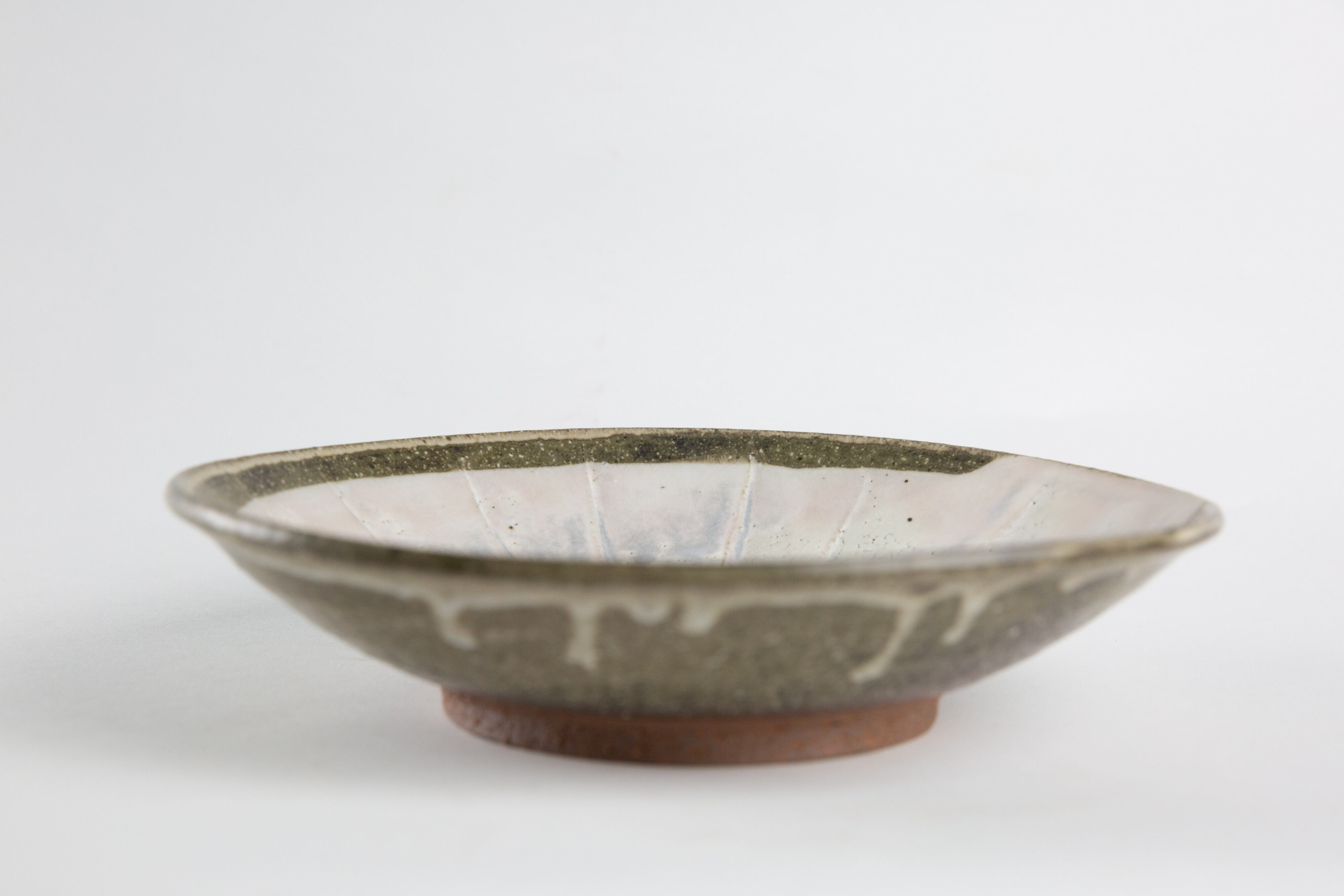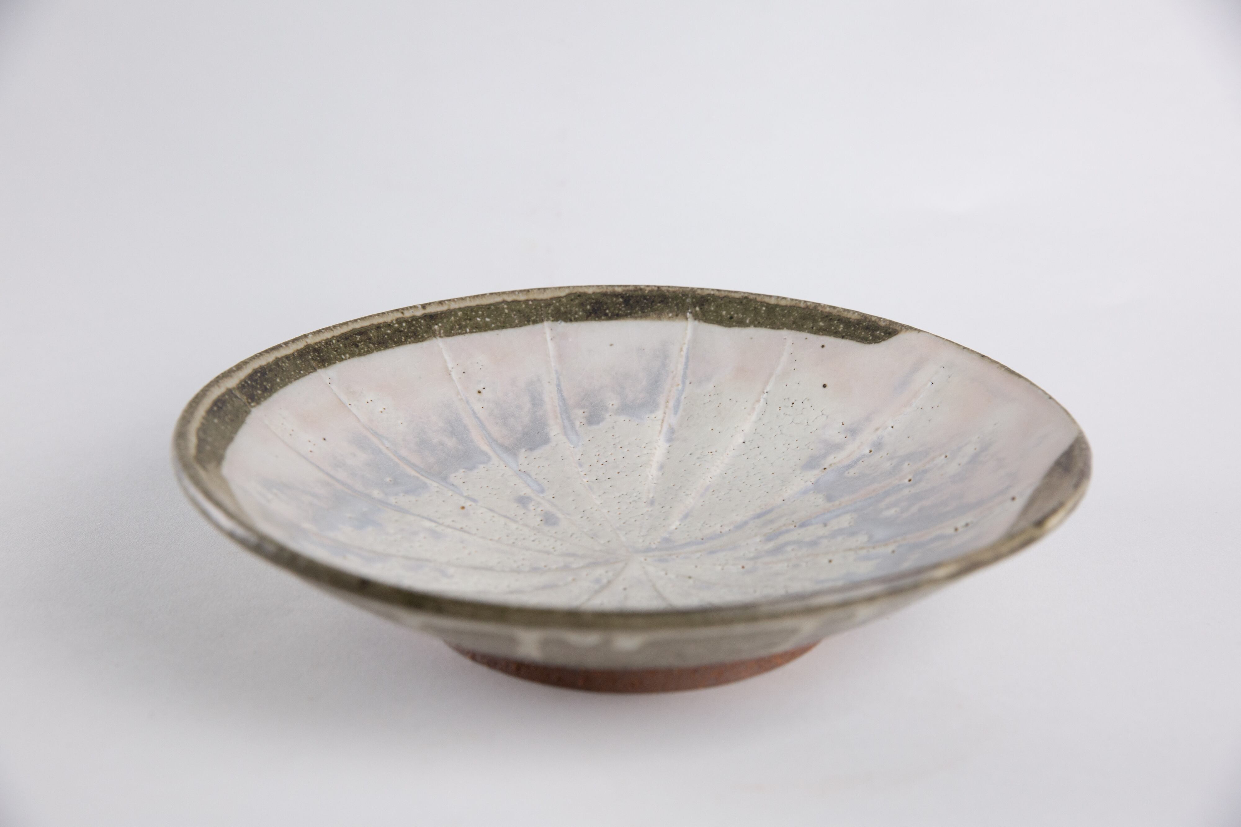粉引き(白化粧という白い泥をかけること)した上に灰釉を掛けています。