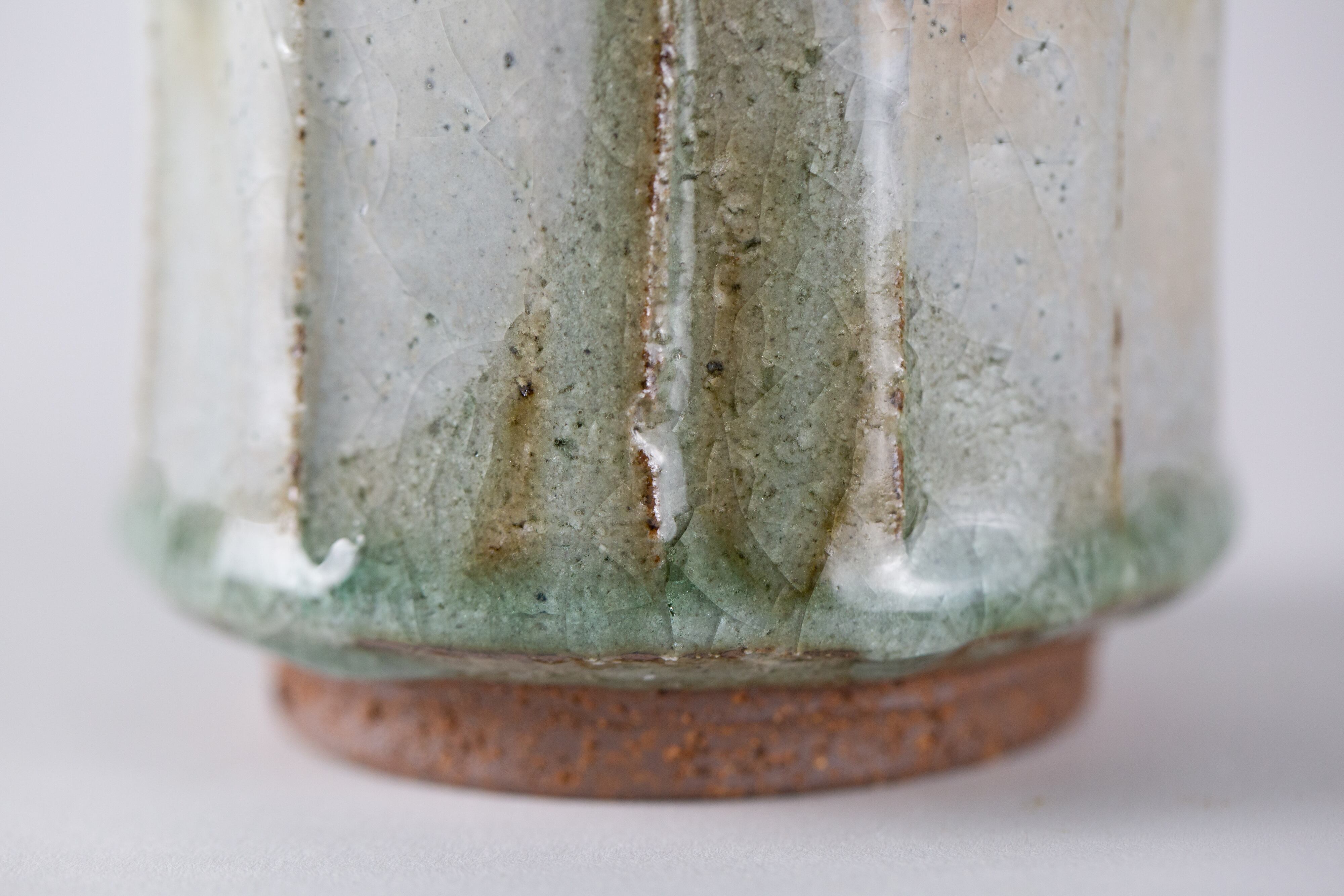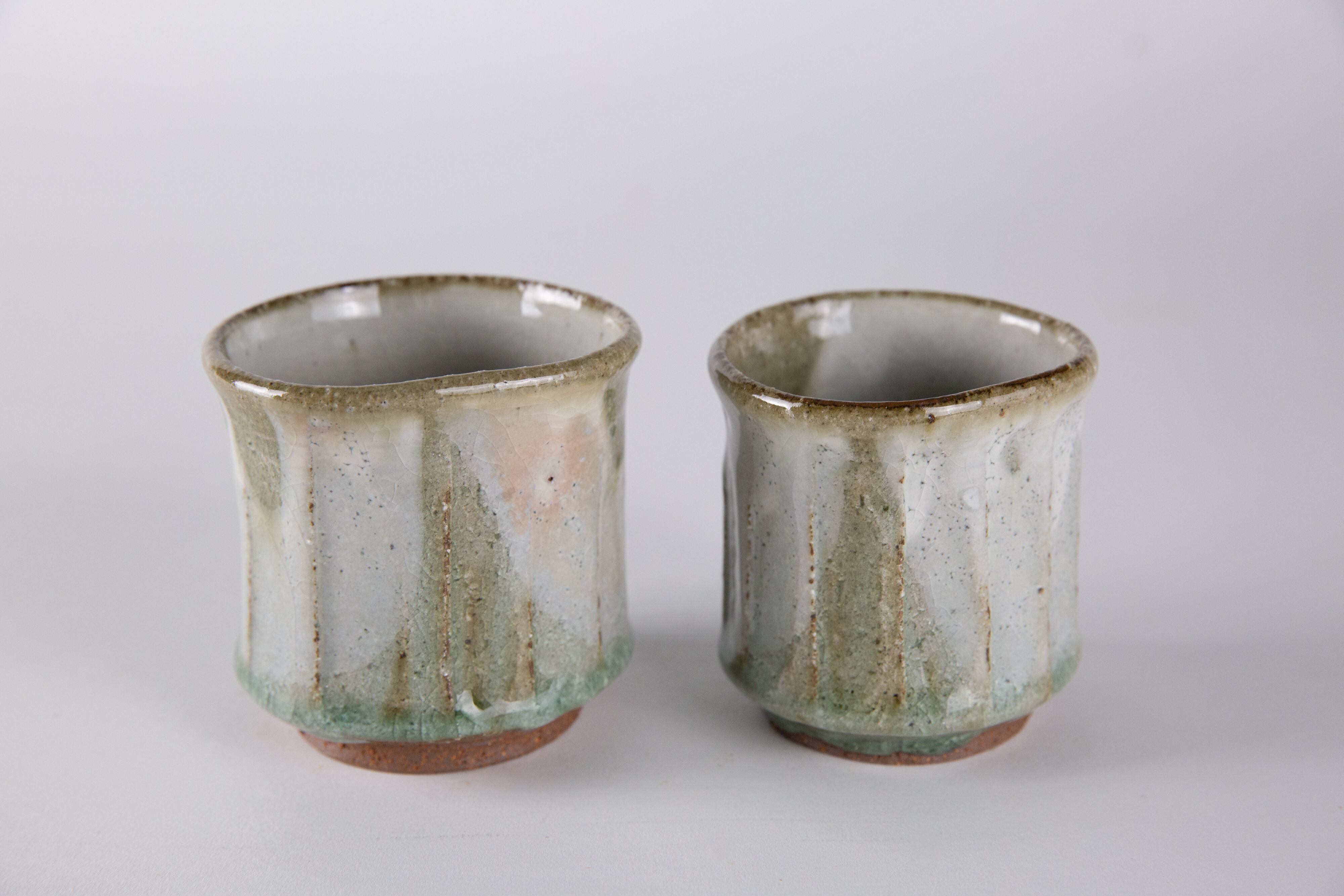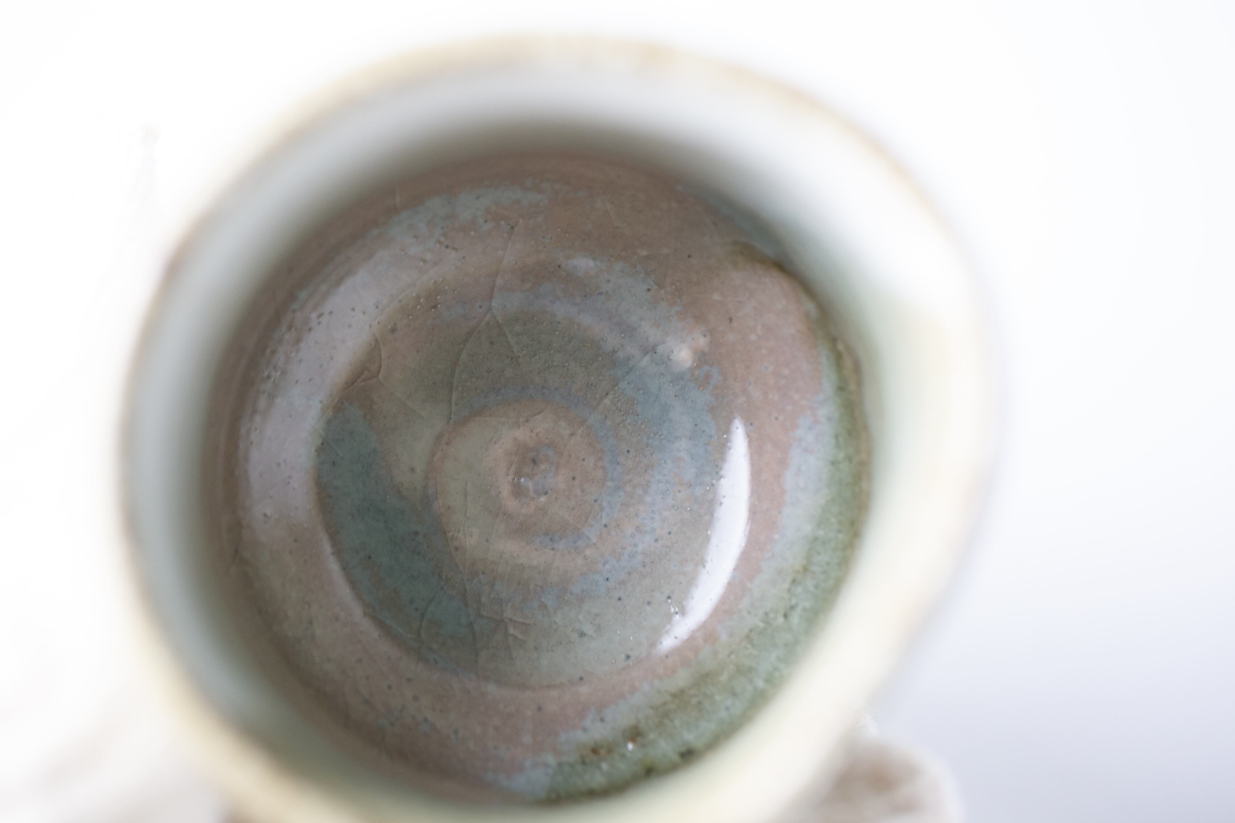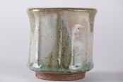 りんごの木の灰で造った釉薬です。地元の荒い赤土に化粧掛けし、その上に釉薬を掛けたものです。少しピンク色に発色している部分もあり、りんご灰特有の碧みがかかった透明感が美しい湯呑です。貫入の入り方も美しいです。