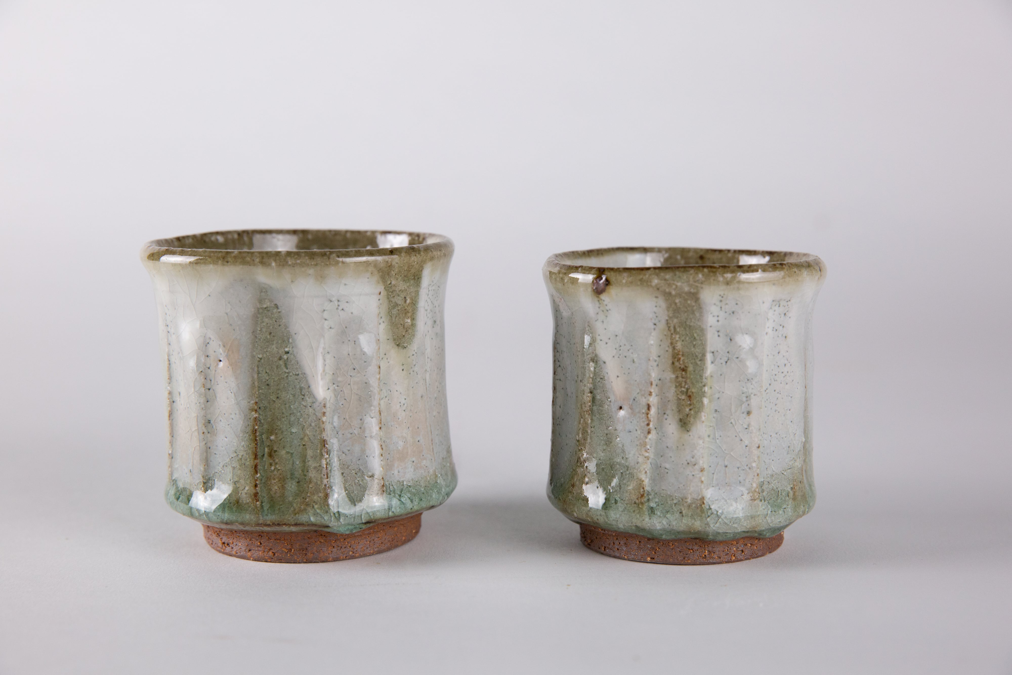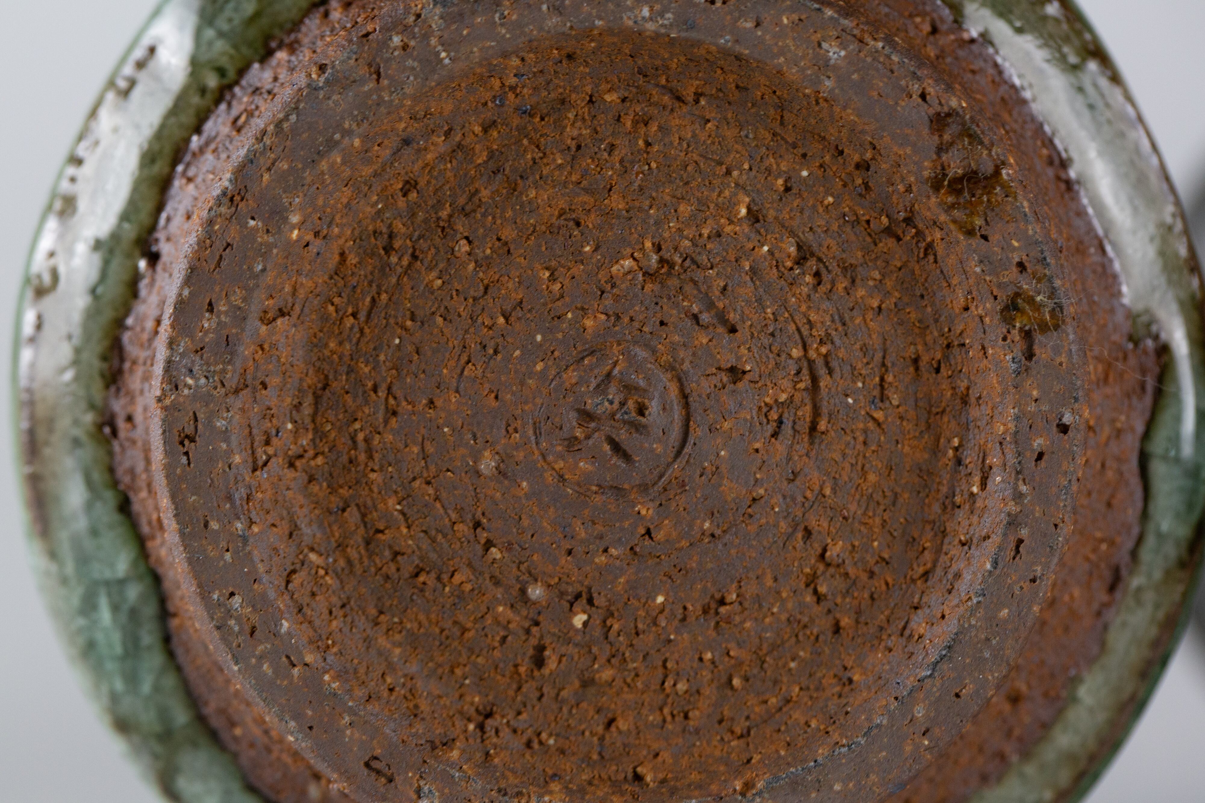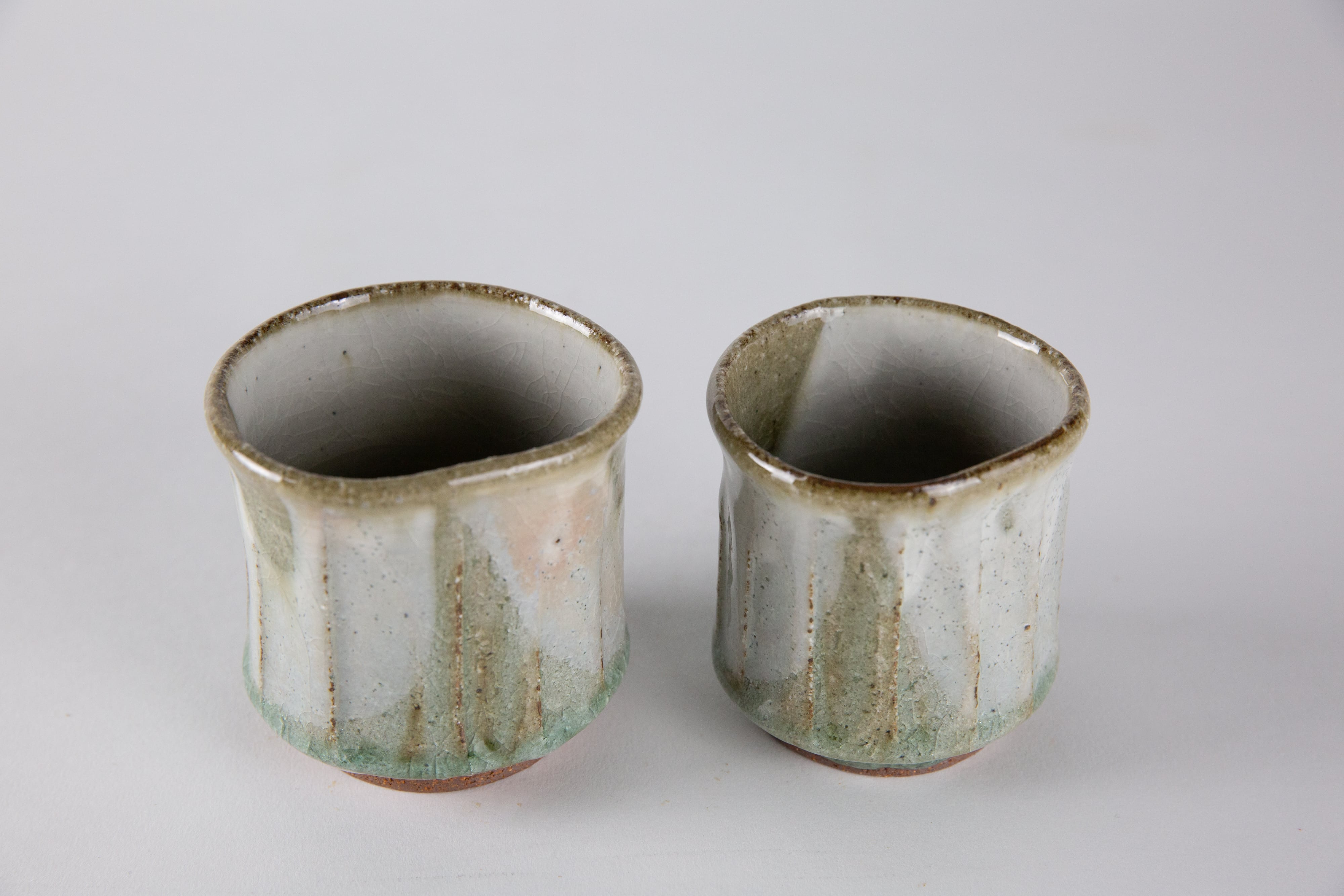 りんごの木の灰で造った釉薬です。地元の荒い赤土に化粧掛けし、その上に釉薬を掛けたものです。少しピンク色に発色している部分もあり、りんご灰特有の碧みがかかった透明感が美しい湯呑です。貫入の入り方も美しいです。